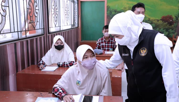 TIMES Samarinda/Gubernur Khofifah saat meninjau PTM terbatas. (FOTO: Dok.Humas Pemprov Jatim)