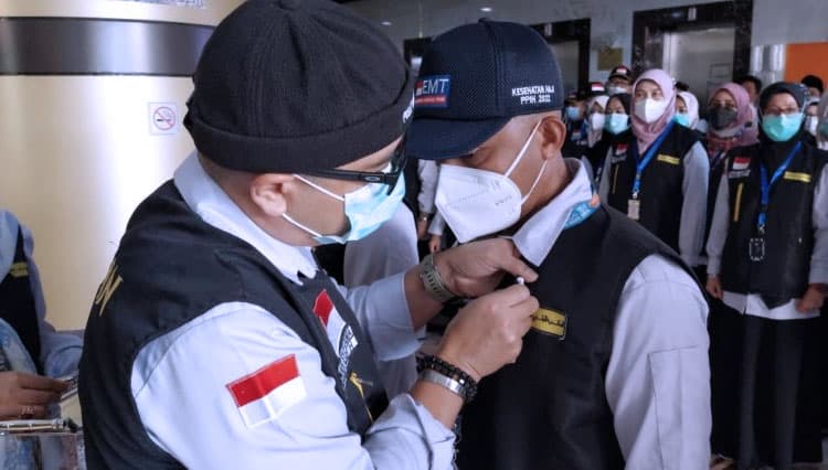 JAKARTA – Kepala Pusat Kesehatan Haji Kementerian Kesehatan (Kapuskes Haji Kemenkes) Budi Sylvana menyematkan pin PPIH bidang kesehatan kepada para petugas bidang kesehatan pada apel siaga penutupan operasional Kantor Kesehatan Haji Indonesia (KKHI) Makkah pada Jumat (5/8/2022) sore kemarin waktu setempat.