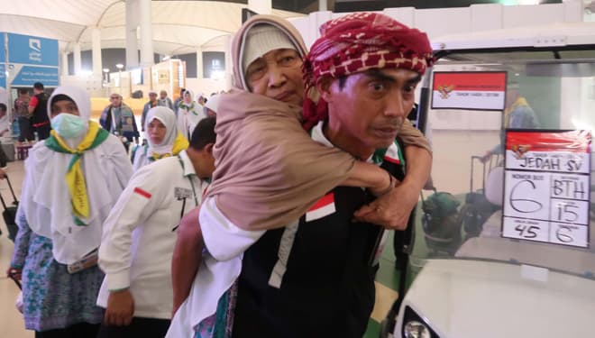 TIMES Samarinda/Petugas PPIH menggendong jemaah risti di bandara KAIA Jeddah, jelang pulang ke tanah air. (FOTO : istimewa).